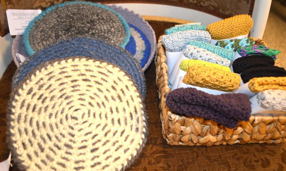 Meillä on myynnissä kädentaitajiemme valmistamia tuotteita mm. villasukkia, lapasia, asusteita, koruja, avaimenperiä, kodintekstiilejä sekä somisteita.